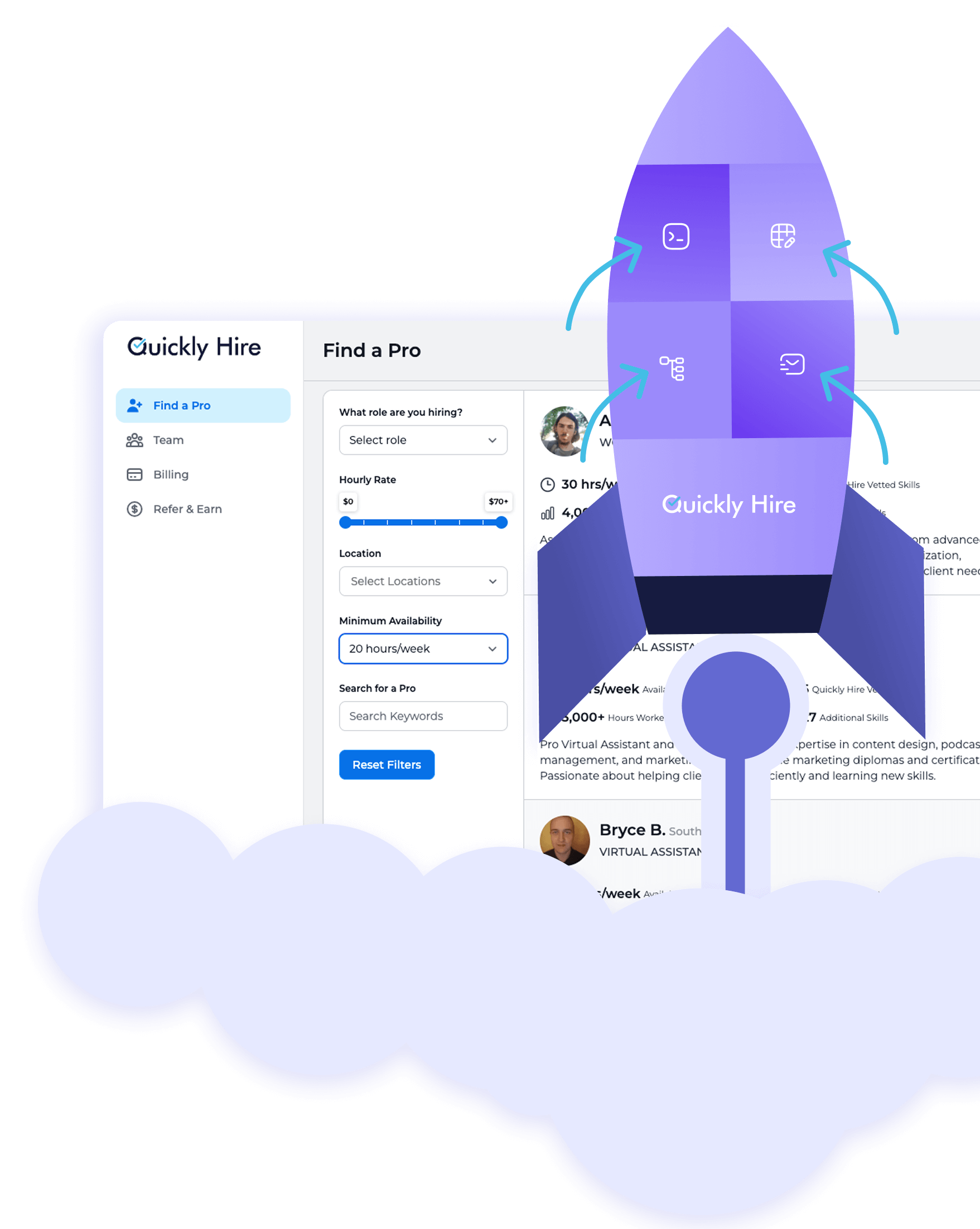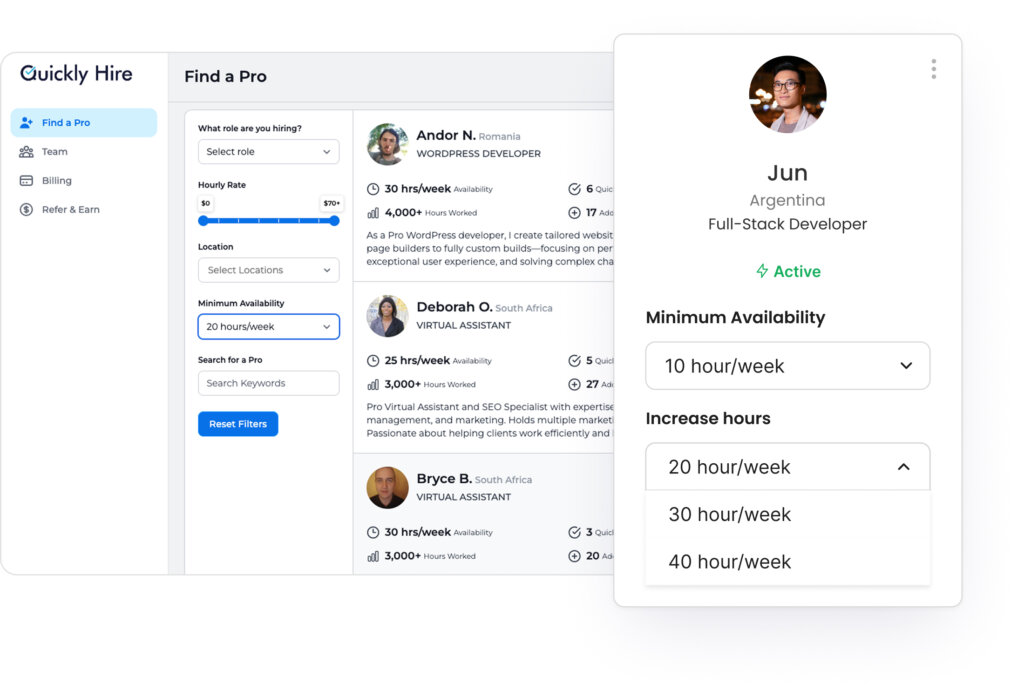 Increase or decrease hours with changing business needs. Start with 10 hours per week and scale to 20 or 40 as projects expand. Adjust your team composition without the risk of hiring or the pain of layoffs.
